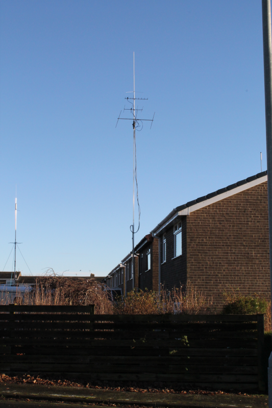 In order to reduce the load on the aluminium mast, I've removed the dual band collinear and replaced it with a tri-band (6m, 2m & 70cms) one and mounted it on the chimney stack. I've also got my weather station up there too.