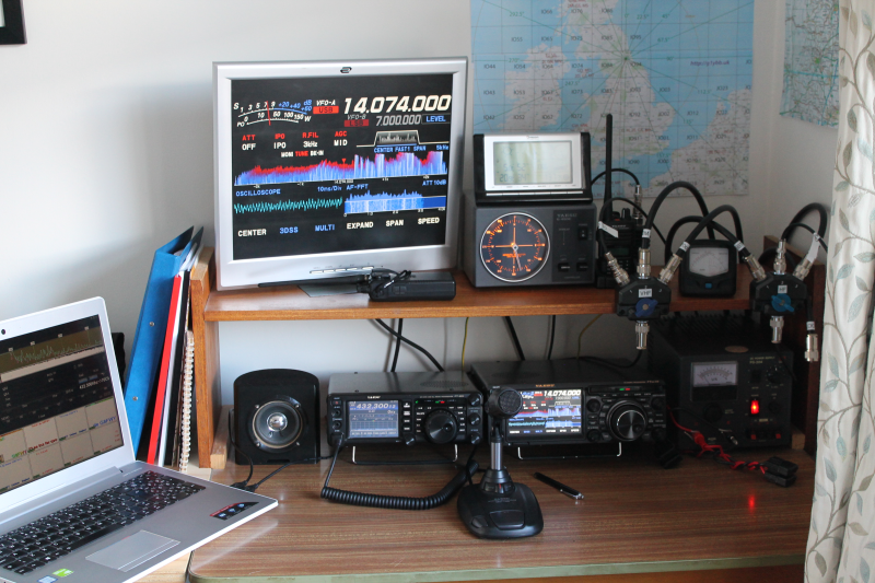 The ham radio corner with the FT 950 and immediately above that, an arduino based power / swr meter.